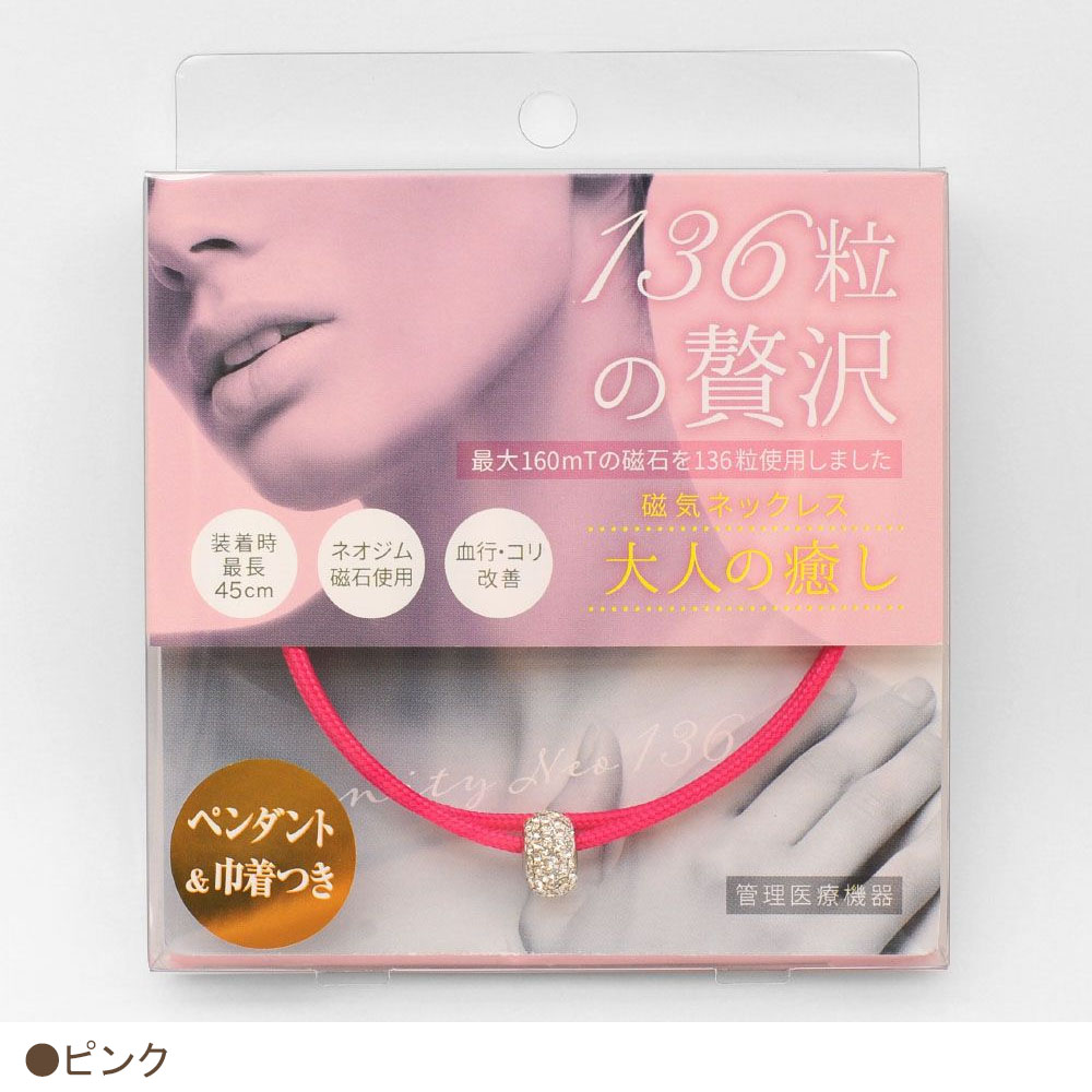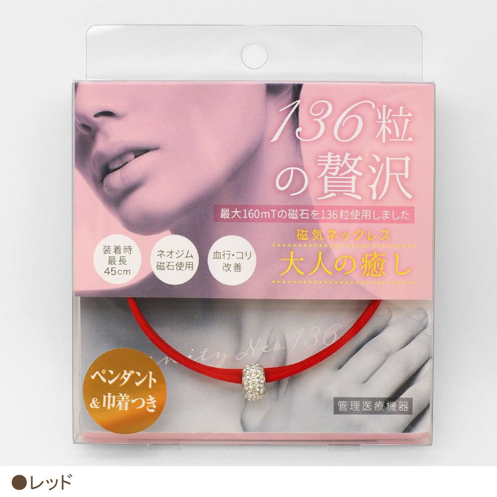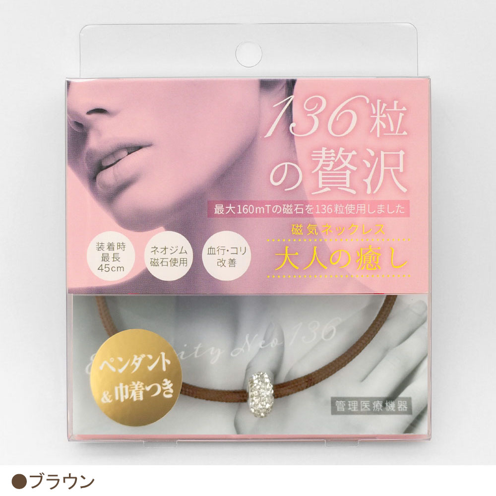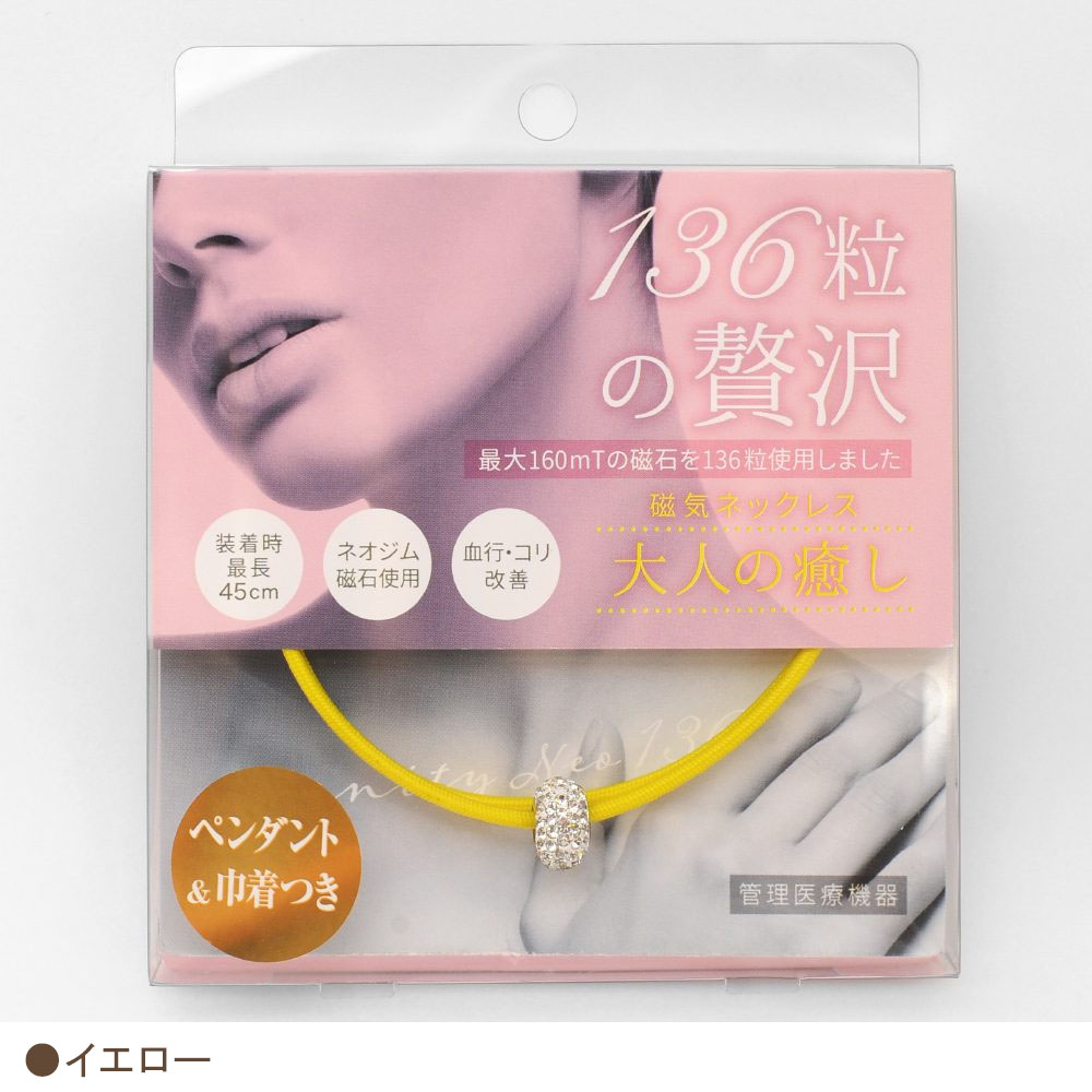 強力なネオジム磁石を136個使用し、1つ1つにカッティングを施しているのでしなやかな装着感。全体にネオジム磁石を入れることでネックレス全体で血行改善効果を発揮します!