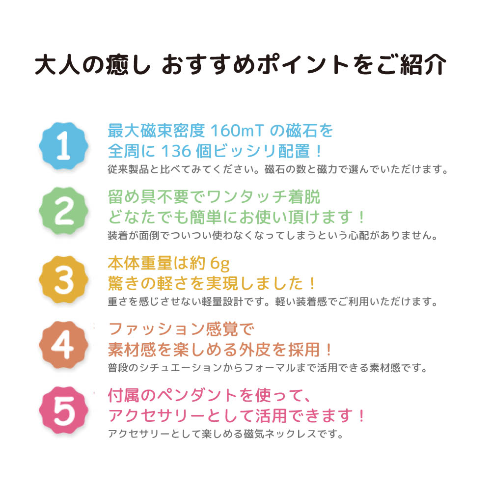管理医療機器の認定を受けた磁気ネックレス。留め具がなく簡単に着脱していただけます。全長約55センチ(装着時最長45センチ)でお好みの長さに調整可能なフリーサイズです。