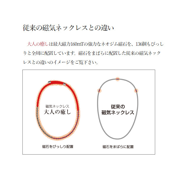 管理医療機器の認定を受けた磁気ネックレス。留め具がなく簡単に着脱していただけます。全長約55センチ(装着時最長45センチ)でお好みの長さに調整可能なフリーサイズです。